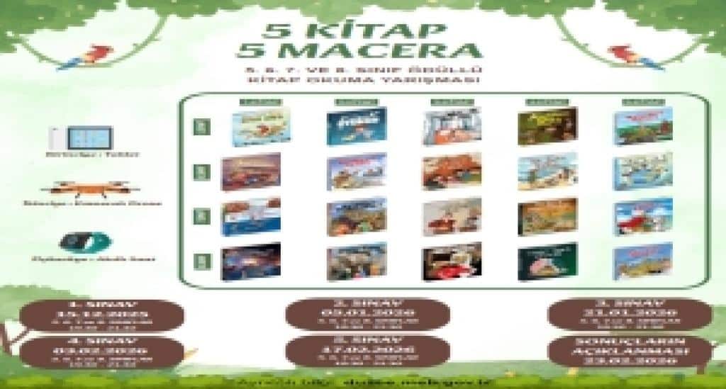 Düzce İl Milli Eğitim Müdürlüğümüz tarafından hayata geçirilen "5 Kitap 5 Macera" Projesi ile 2. sınıftan 8. sınıfa kadar öğrencilerimiz, seçilen kitapları okuyarak çevrimiçi sınavlarla yarışacak ve okuma alışkanlıklarını pekiştirecekler.